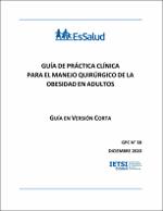 Objetivo: brindar recomendaciones clínicas basadas en la evidencia para el manejo quirúrgico de la obesidad en adultos. Método: se formó un grupo de trabajo de la guía (GTF) con médicos y metodólogos especializados. El grupo propuso 10 preguntas clínicas para ser respondidas en esta Guía de práctica clínica (GPC). Se realizaron búsquedas sistemáticas de revisiones preliminares y cuando fue necesario se revisaron estudios primarios de PubMed y Central hasta noviembre de 2019. La evidencia fue seleccionada con el objetivo de responder a cada pregunta propuesta. La certeza de la evidencia se evaluó utilizando la metodología Grading of Recommendations Assessment, Development, and Evaluation (GRADE). En sesiones de trabajo periódicas, el grupo utilizó la metodología GRADE para la revisión de la evidencia y formuló recomendaciones, ítems de buena práctica clínica y los diagramas de flujo. Finalmente, la GPC fue aprobada mediante Resolución Nº 115-IETSI-ESSALUD-2020. Resultados: Esta GPC abordó 7 preguntas clínicas sobre el manejo quirúrgico de la obesidad en adultos. Con base en estas preguntas; se formularon 6 recomendaciones (3 fuertes y 3 condicionales), 18 ítems de buena práctica clínica y 2 diagramas de flujo Objective: to provide evidence-based clinical recommendations for surgical management of obesity in adults. Method: a guideline task force (GTF) was formed with specialized physicians and methodologists. The group proposed 10 clinical questions to be answered in this Clinical practice guideline (CPG). Systematic searches of preview reviews were performed and when it was necessary, primary studies from PubMed and CENTRAL until November 2019 were reviewed. The evidence was selected aiming to answer each proposed question. Certainty of evidence was evaluated using Grading of Recommendations Assessment, Development, and Evaluation (GRADE) methodology. In periodical work sessions, the group used GRADE methodology for reviewing the evidence and formulated recommendations, good clinical practice items and the flowcharts. Finally, the CPG was approved by Resolution Nº 115-IETSI-ESSALUD-2020. Results: This CPG approached 7 clinical questions about the surgical management of obesity in adults. Based on these questions; 6 recommendations (3 strong and 3 conditional), 18 good clinical practice items and 2 flowcharts were formulated