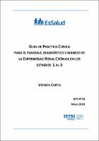 Este artículo resume la Guía de Práctica Clínica (GPC) para el tamizaje, diagnóstico y manejo de la enfermedad renal crónica (ERC) estadios 1 a 3 en el Seguro Social de Salud (EsSalud). Para realizar esta GPC se formó un grupo de trabajo de guías (GTF) con médicos especialistas y metodólogos, el grupo propuso ocho preguntas clínicas. Para responder a cada pregunta se realizaron búsquedas sistemáticas de revisiones previas y cuando fue necesario se revisaron los estudios primarios y se seleccionó la evidencia relevante. La certeza de la evidencia se evaluó utilizando la metodología Grading of Recommendations Assessment, Development, and Evaluation (GRADE). En sesiones de trabajo periódicas, el grupo utilizó la metodología GRADE para revisar la evidencia y formular recomendaciones. Se formularon ocho recomendaciones (cuatro fuertes y cuatro condicionales), 29 ítems de buena práctica clínica y 3 diagramas de flujo This paper abstracts the Clinical Practice guideline (CPG) for the screening for, diagnosis and management of the chronic kidney disease (CKD) stages 1 to 3 in Peruvian Social Security (EsSalud). To perform this CPG, a guideline task force (GTF) was formed with specialized physicians and methodologists, the group proposed eight clinical questions. To answer each question, systematic searches of preview reviews were performed and when it was necessary, primary studies were reviewed, and the relevant evidence was selected. Certainty of evidence was evaluated using Grading of Recommendations Assessment, Development, and Evaluation (GRADE) methodology. In periodical work sessions, the group used GRADE methodology for reviewing the evidence and formulating recommendations. Eight recommendations (four strong and four conditional), 29 good clinical practice items and 3 flowcharts were formulated