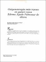 Se evaluó la terapéutica al tratamiento con sólo oxígeno y reposo según remisión clínica y radiológica. Were studied prospectively 15 cases of high-altitude pulmonary edema with clinical and radiological diagnosis and between may 1986 and may 1987 in the mining community of Lima - Raura (with an altitude more than 4,800 meters). four of the patients were classified as Clinical Grade II and eleven as Clinical Grade III. An evaluation was made of the to therapeutic treatment using only oxygen and bed rest in acordance with clinical and radiological setback.